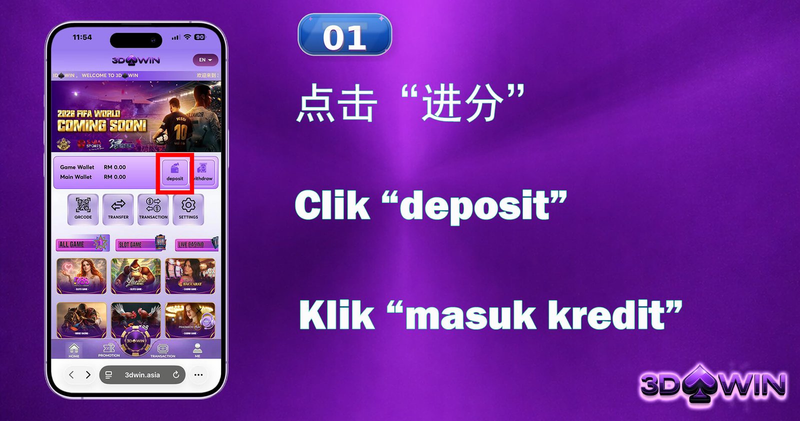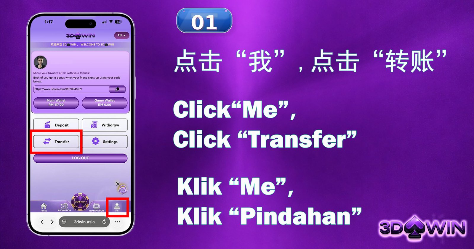 Untuk bermula, log masuk ke akaun anda, sentuh pilihan Deposit pada halaman utama dan pilih Pindahan sebagai kaedah pembayaran anda.