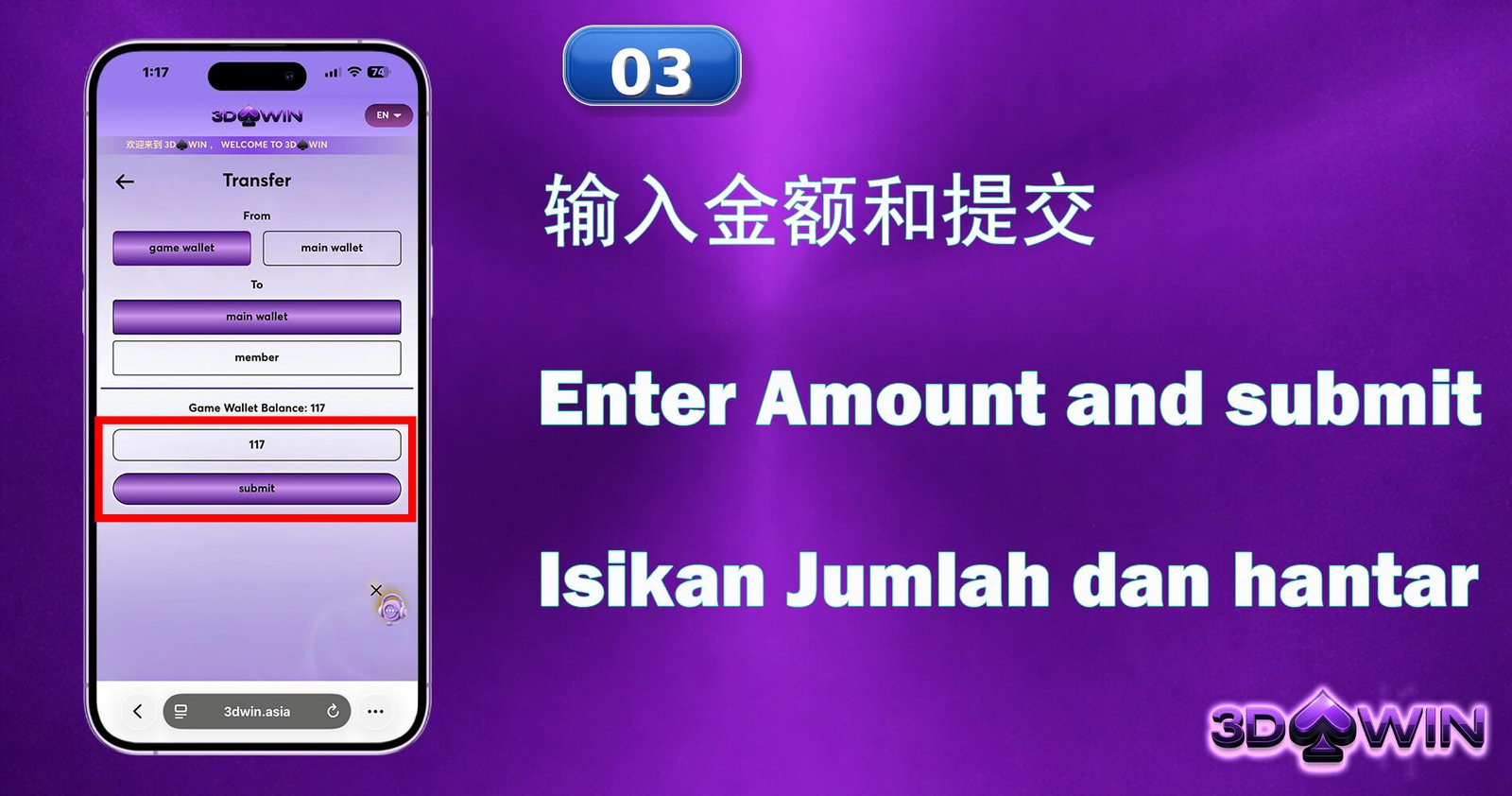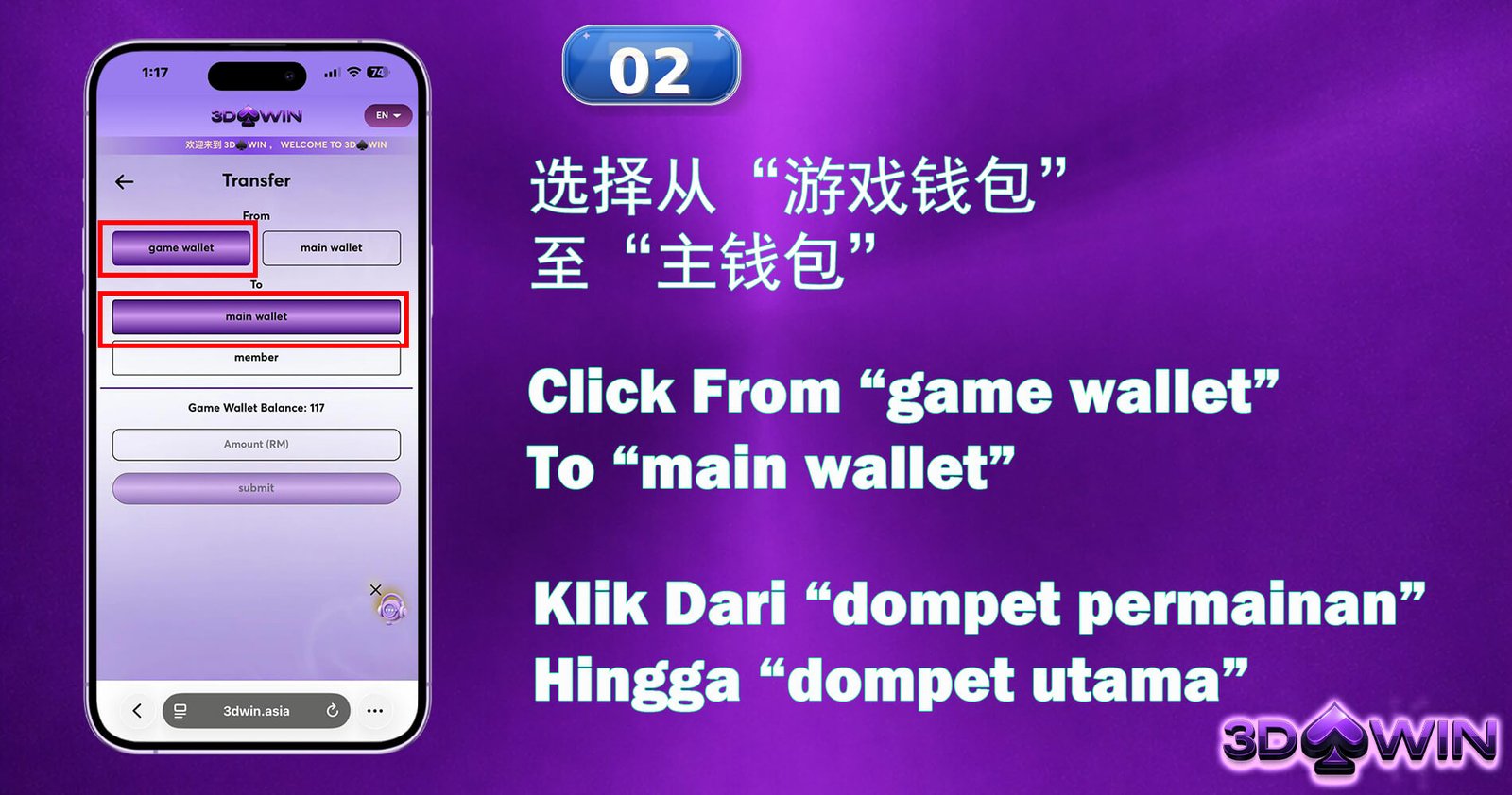 Pilih Dompet Permainan sebagai sumber dan Dompet Utama sebagai destinasi pada skrin Pemindahan. Ini mengembalikan kredit permainan anda kepada baki utama anda sebelum pengeluaran.