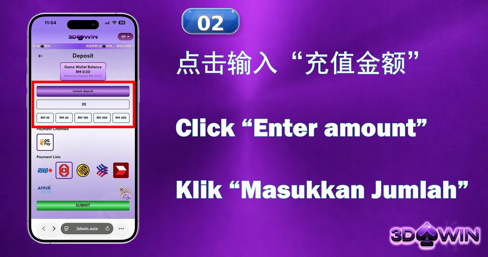 Masukkan jumlah yang anda ingin tambah ke dompet anda sebagai tambah nilai. Anda boleh memilih jumlah yang telah ditetapkan atau menaip nilai tersuai. Terdapat deposit minimum yang diperlukan.