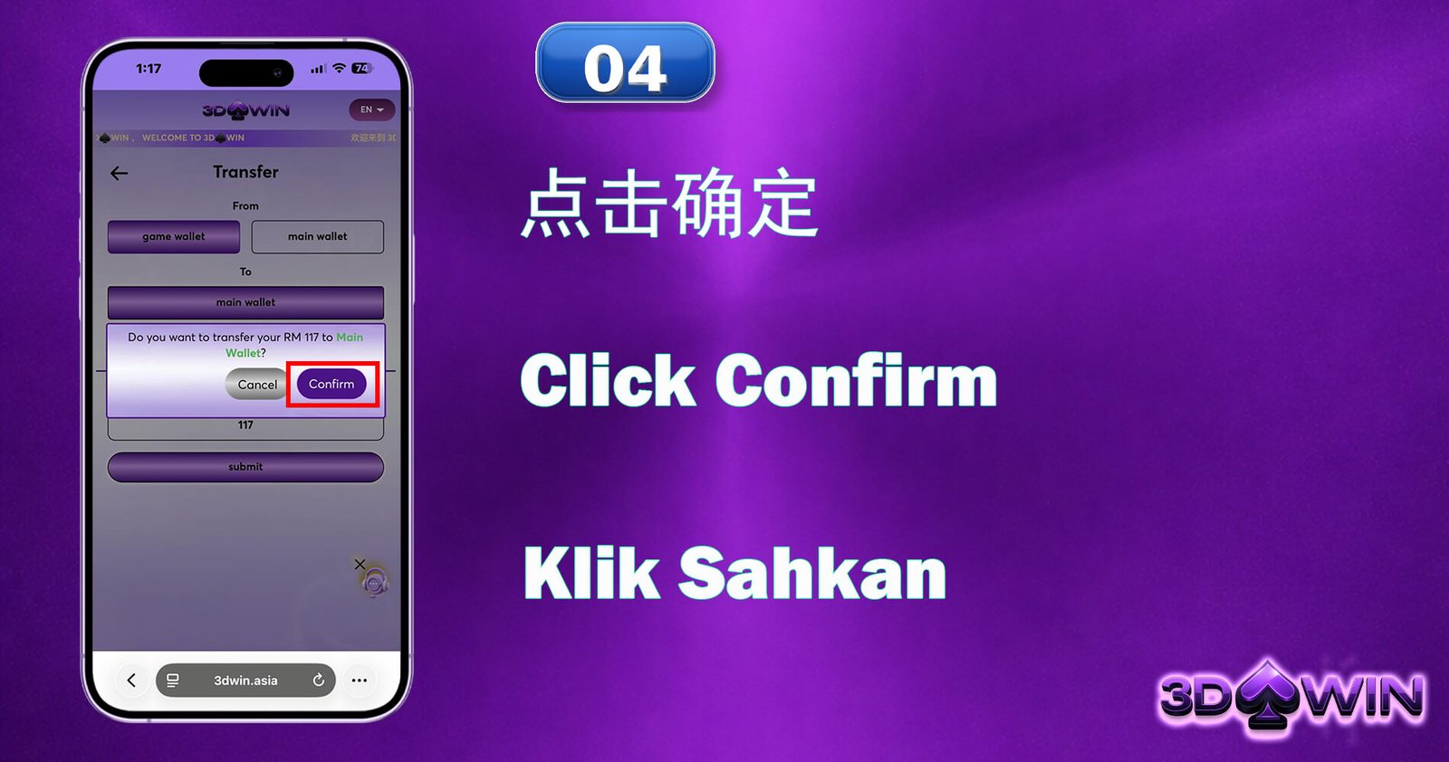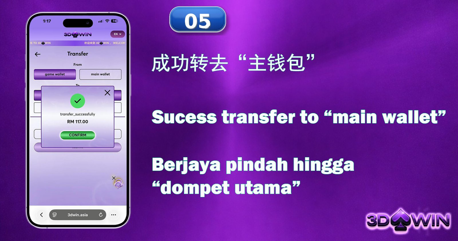 Pemindahan kredit permainan anda ke Dompet Utama anda telah selesai. Baki dalam Dompet Utama anda telah dikemas kini dan kini tersedia untuk pengeluaran.