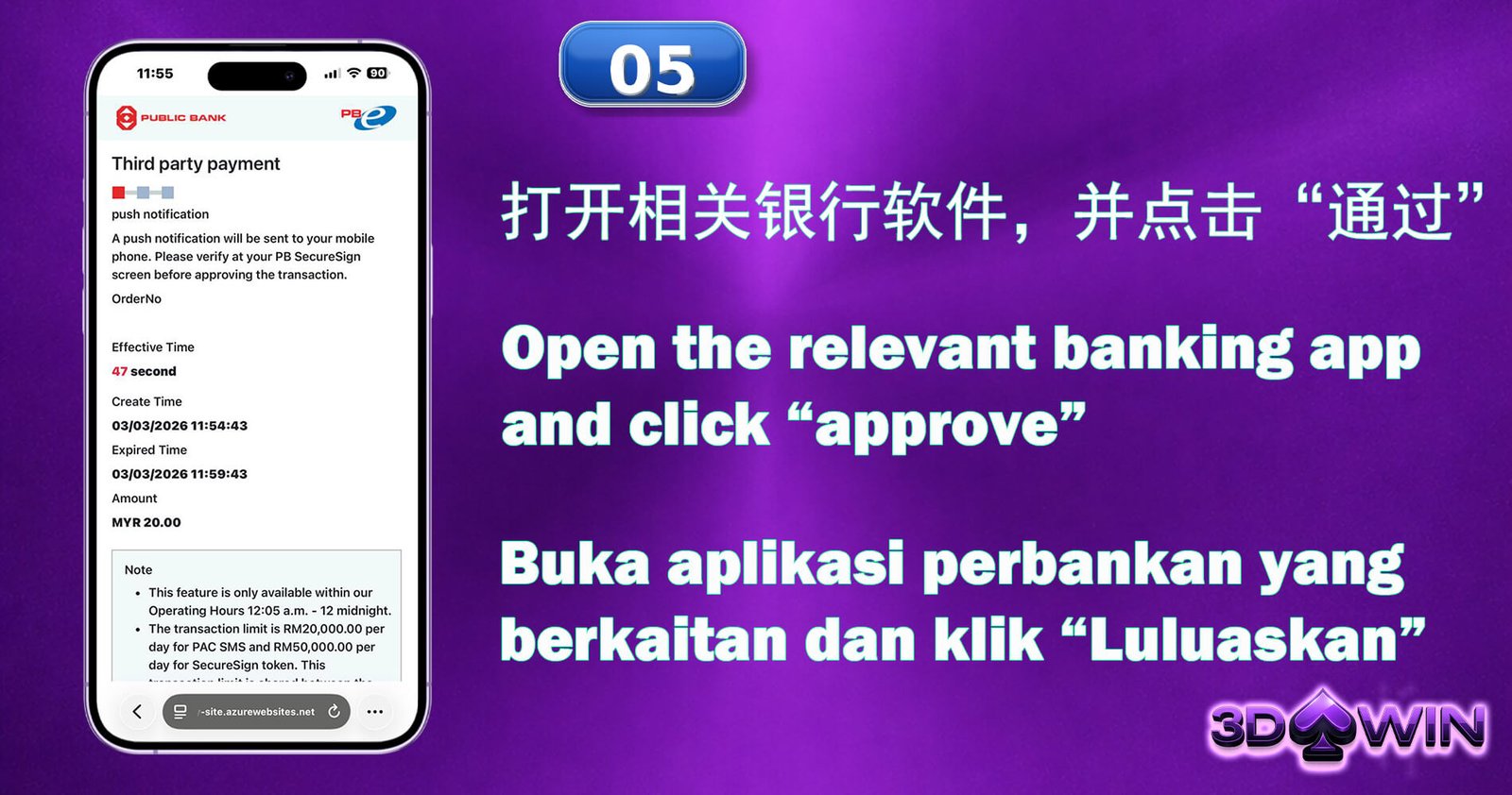 Lancarkan aplikasi perbankan mudah alih rasmi untuk bank anda. Untuk mengesahkan dan membenarkan transaksi deposit dengan selamat, tekan Luluskan apabila mesej kelulusan pembayaran muncul.