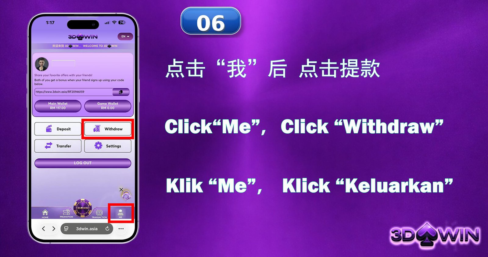 Untuk memulakan proses pemindahan dana, log masuk ke akaun anda, pilih bahagian Saya daripada menu bawah, kemudian pilih Pindahan.